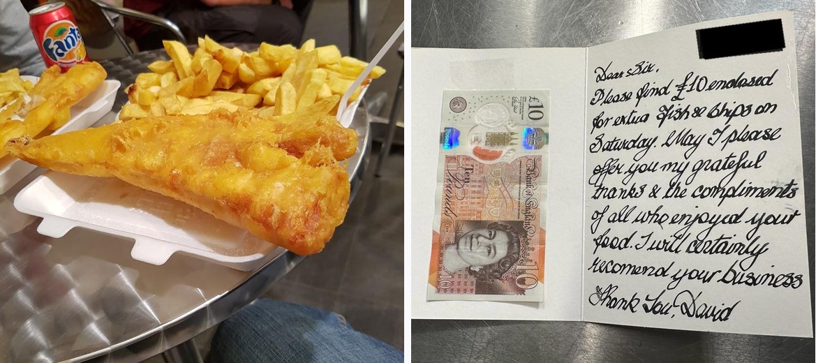 Fresh cooked, crispy battered cod, good portions of fish & chips, clean & friendly, visited local area & reviews were good, so tried it, great meal.